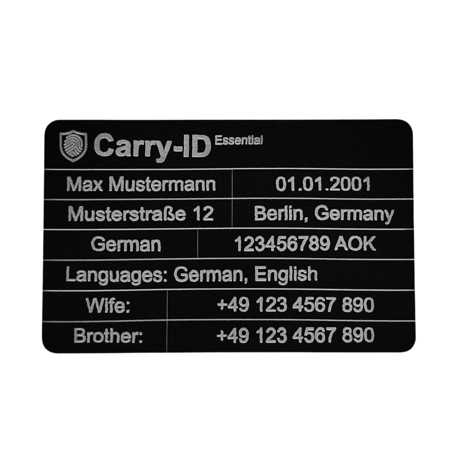 Die Essential-Karte aus hochwertigem Aluminium verbindet minimalistisches Design mit persönlicher Gravur. Leicht, individuell und immer einsatzbereit – dein Begleiter für mehr Sicherheit und Identität.